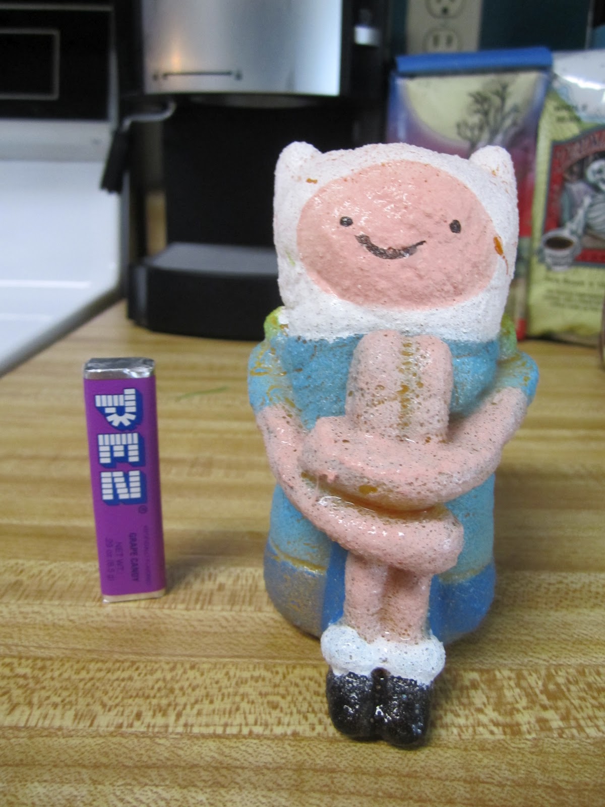 Now, off the bat...I'm unimpressed. Could be the angle, could be the level of light, could be the UNBELIEVABLY HIGH EXPECTATIONS I've been harboring for the last week and a half. If I wasn't preoccupied by roller coasters and giant pickles, I was obsessively thinking and wondering about Finn and his mega-growth into a towering monster. If you recall, the packaging promised an increase of Finn by five hundred times. I knew the odds were against me, I knew the claims were outrageous, but throughout my absence, I held hope. They said to wait a solid seven days for maximum results, so I did it better and bigger: I waited eight days.